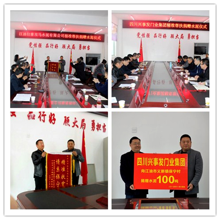 捐赠仪式上,江油拉豪双马水泥有限公司为江油市义新镇保宁村捐赠水泥300吨,四川兴事发门业集团为江油市义新镇保宁村捐赠水泥100吨。两个企业主要负责人都纷纷表示,扶贫济困、奉献爱心、参与脱贫、制造业反哺农业是企业义不容辞的社会责任。企业欢迎保宁村村民到企业选择合适岗位就业,通过就业致富,并祝愿保宁村早日实现脱贫,早日全面步入小康社会。保宁村村支两委对两个企业的慷慨解囊、无私帮助表示衷心感谢,并回赠“情系保宁 扶贫帮困”锦旗。